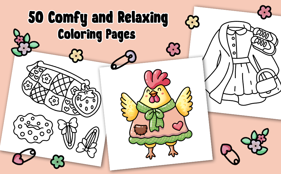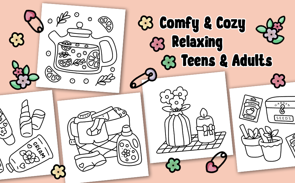 Illustrationerne er designet i en bold & easy-stil med tydelige linjer, så det er nemt og afslappende at farvelægge – uden pres og uden perfektion.