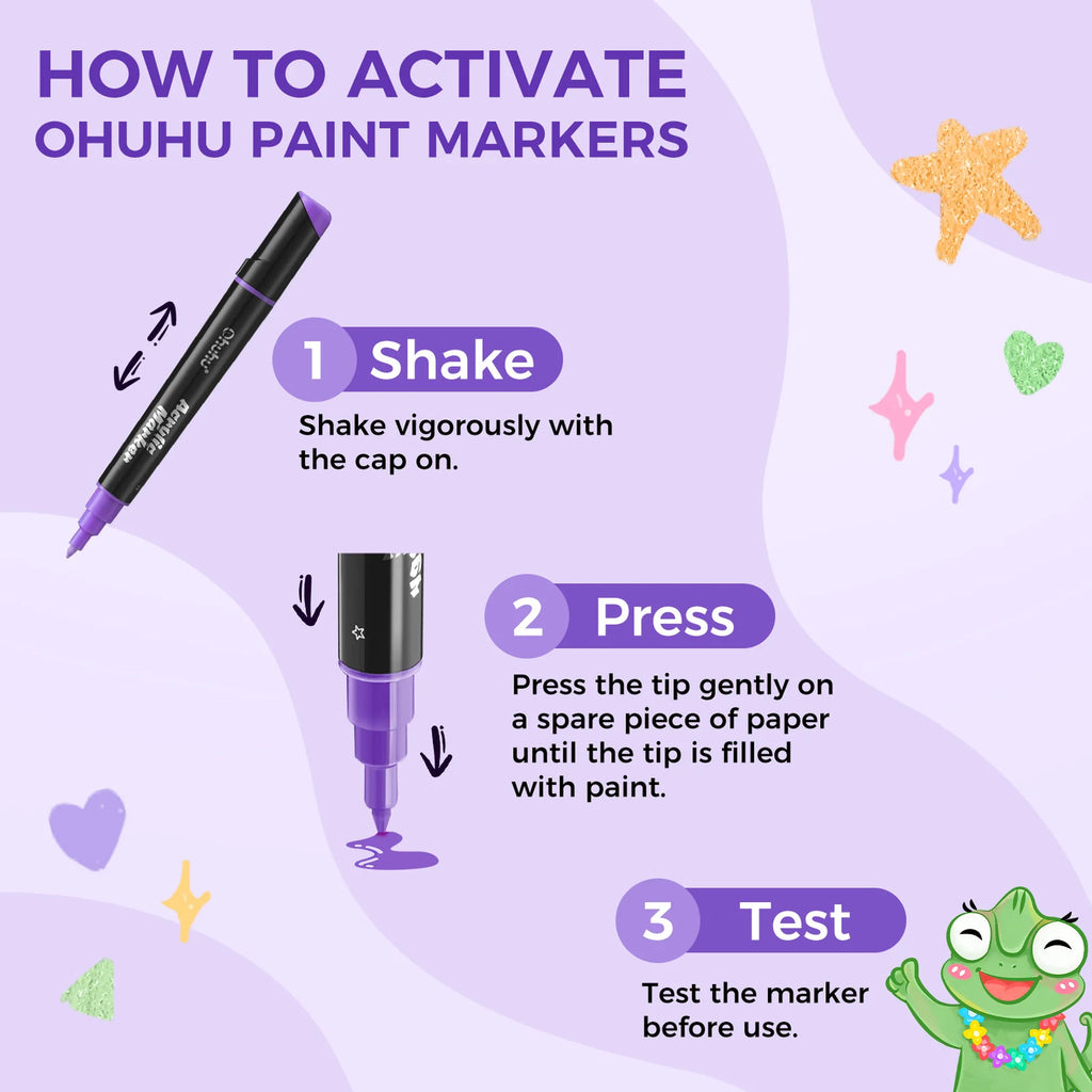 Disse Ohuhu Dual Nib Acrylic Markers er vandbaserede akryltusser med høj dækkeevne, designet til kreative projekter på hårde og faste overflader. Perfekte til dig, der vil dekorere, male og lave detaljerede designs – uden brug af pensel.